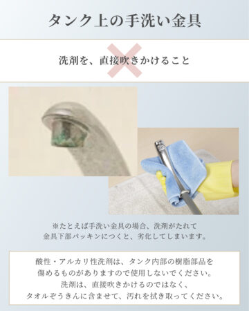 酸性洗剤やアルカリ性洗剤の中には、タンク内部の樹脂部品を傷めるものがある。洗剤はタオルぞうきんに含ませて使用すること。
