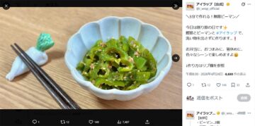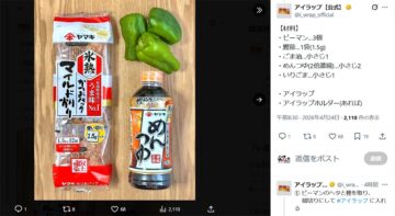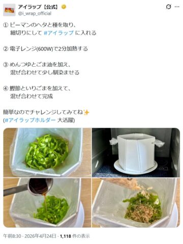 冷凍・冷蔵保存や電子レンジ、湯せんでの加熱にも使えるポリ袋「アイラップ」の公式「X」アカウントが、「無限ピーマン」のレシピを紹介しています。