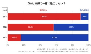 さらに、「(夫婦仲が)悪い」と回答した層では、「(GWは夫婦で一緒に)過ごしたい」は16.4%にとどまり、「過ごしたくない」が83.6%と大きく上回っています。