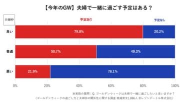 一方、「(夫婦仲が)普通」では「過ごしたい」が56.9%、「(GWは夫婦で一緒に)過ごしたくない」が43.1%とほぼ拮抗(きっこう)する結果となりました。