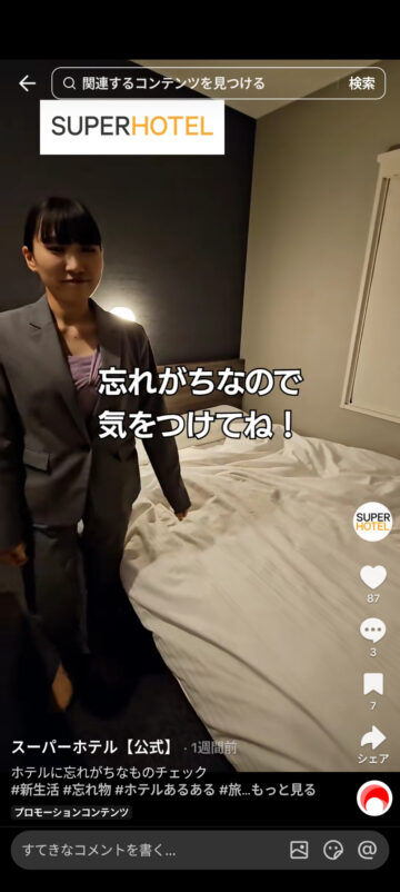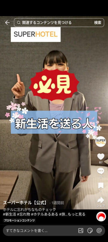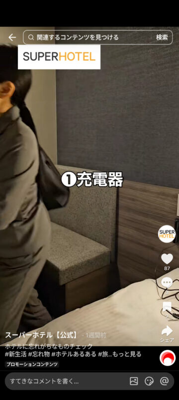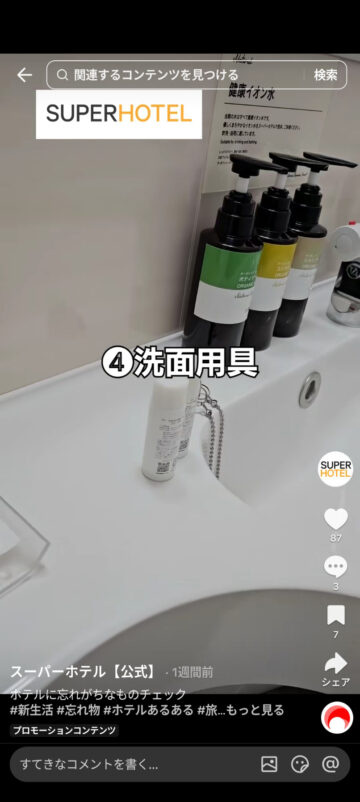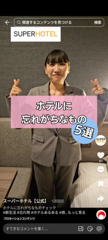 ホテルの宿泊時によく忘れがちな物について、スーパーホテルが公式TikTokアカウントで紹介しています。
