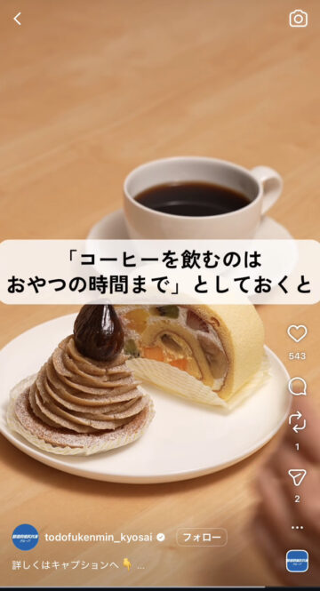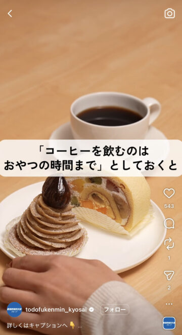 また、公式アカウントは「摂取したカフェインの半減期は、長くて8時間程度(個人差があります)」「睡眠のことを考えると、コーヒーなら1日1〜2杯までにしておくのがおすすめ!」と解説し、「コーヒーを飲むのはおやつの時間までとしておくと、眠るときにカフェインの影響を受けにくくなります」とアドバイスしています。