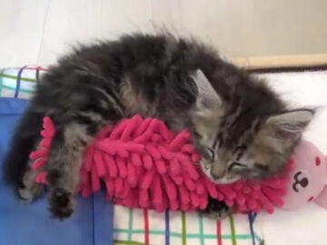 注目を集めたのは「寝言を言いながら人形を抱きしめる子猫 Kitten hugs doll while sleep talking」という動画。子猫のおさむ君が人形を抱きしめ、うとうとと目を閉じている様子からスタートします。寝言のように「フニャー」と鳴き声を上げる様子がなんとも愛らしいですね。