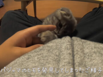 すると、今度は飼い主さんの服のひもで遊び始めるつむ。まん丸な顔とお手てがとってもかわいいですね。