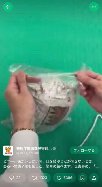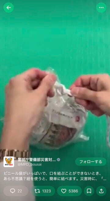 中身いっぱいのビニール袋の口、簡単に結べちゃう! 警視庁の“裏技”に「なるほど!」「手品みたい」