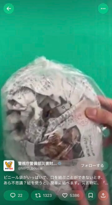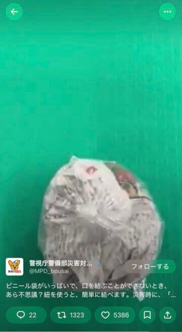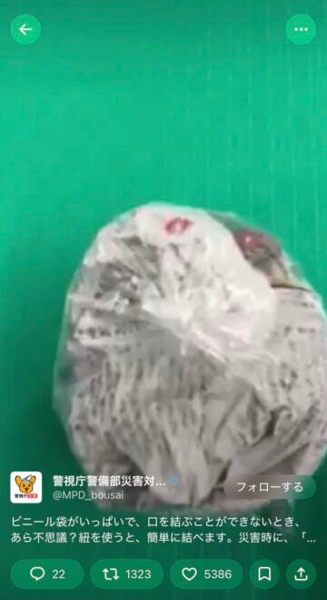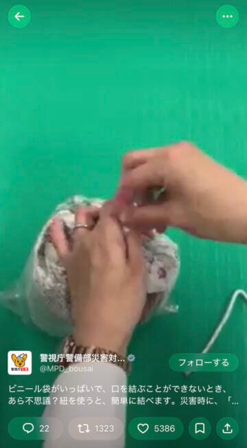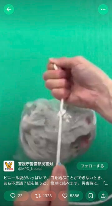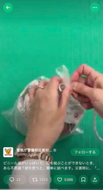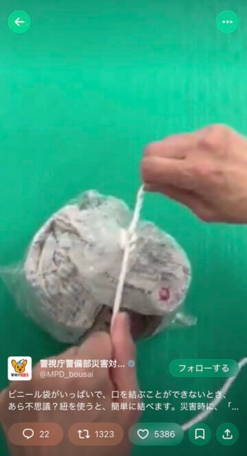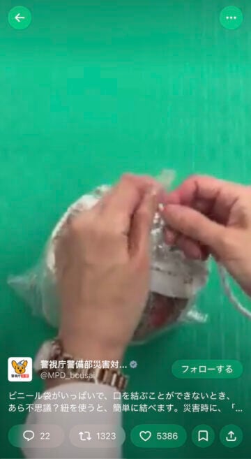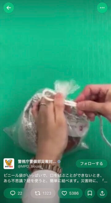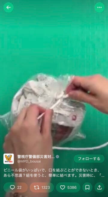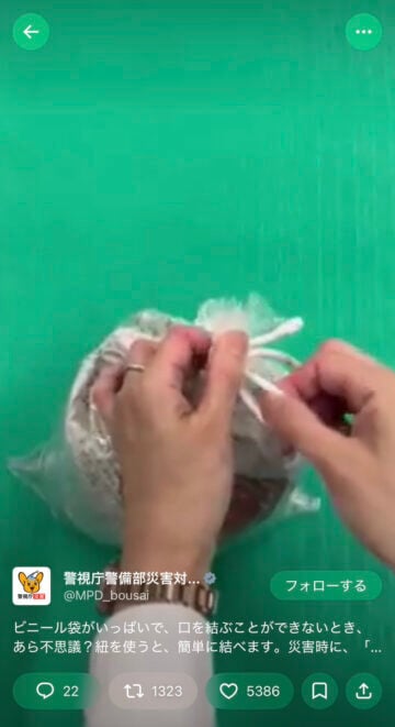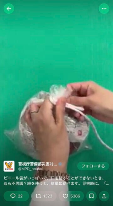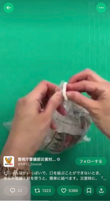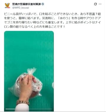 中身がいっぱいになったビニール袋の口を簡単に結ぶ方法について、警視庁警備部災害対策課の公式Xアカウントが紹介しています。