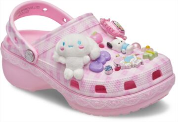 ハローキティ アンド フレンズ クラシック プラットフォーム クロッグは、ピンクのギンガムチェック柄を全面にあしらい、ハローキティやポチャッコ、リトルツインスターズたちがプリントされたデザイン。シナモロールやポムポムプリンなど計19個のジビッツチャームが付属。価格は1万4300円(以下、税込み)です。