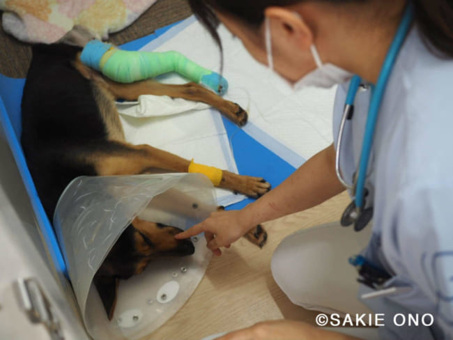 宮古島から東京に移送され、看護される骨折した保護犬