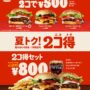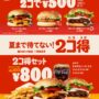 2023.08.18バーガーキングが8月18日から、バーガー単品2個を500円、セットを800円で提供する「2コ得(ニコトク)」キャンペーンを2週間限定で実施中です。